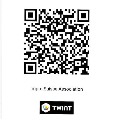 Nous comptons sur votre soutien pour continuer à oeuvrer à la promotions de l'improvisation théâtre en Suisse. Votre argent servira à financer les activités de l'association. Si vous n'avez pas Twint, vous pouvez aussi faire un virement sur notre compte CH91 0900 0000 1432 4073 6, Impro Suisse (Association), Avenue de Milan 30, 1007 Lausanne.